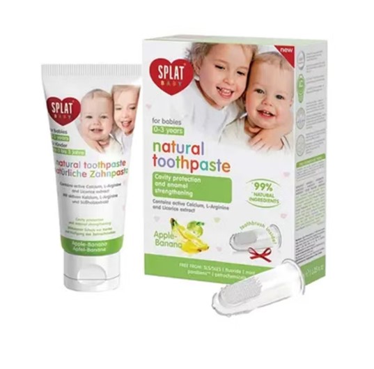 SPLAT BABY ELMA MUZ ÇOCUK DİŞ MACUNU 40 ML+ SİLİKONLU PARMAK DİŞ FIRÇASI KOFRE